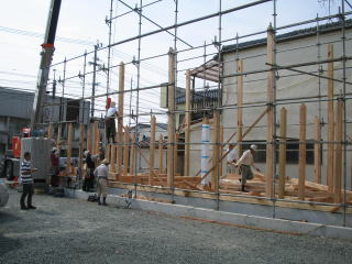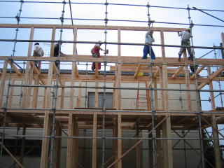 ![]() 外部に足場を組みます。基礎に土台を固定後、柱・梁を組んでいきます。 | ![]() 1階部分組立中。 クレーンで材料を吊上げます。(長い柱は通し柱といいます。) |