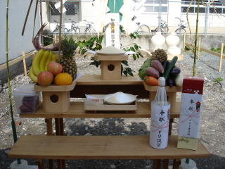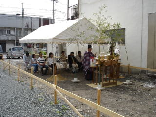 ![]() その土地の守護神に無事完成を祈願する祭りです。米、酒、鯛、野菜を神前に供えます。 | ![]() 神職が神前に工事の安全を願って祝詞を奏上します。 |