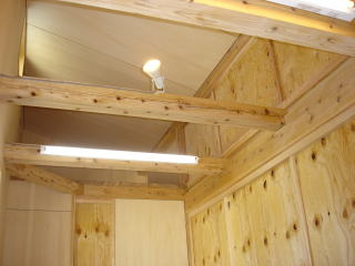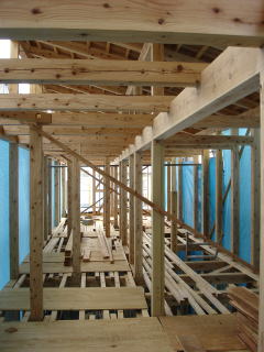 ![]() 2階部分組立中。 | ![]() 棟上終了後 内部 |