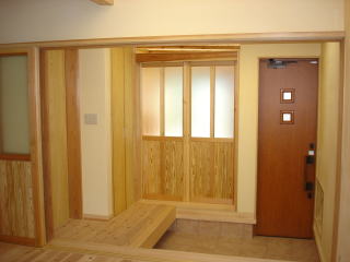 ![]() 居間から玄関を見たところ。玄関と居間は左官さんによる“土佐しっくい”仕上です。 | ![]() (←)左の写真と同じ場所から撮影したもの。建具によって季節や用途に合わせて仕切ることができます。 |