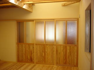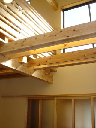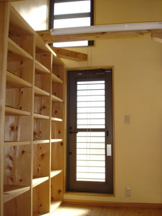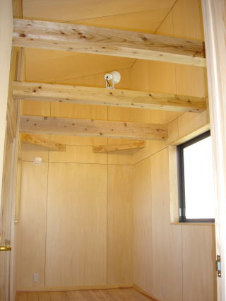 ![]() 2階 吹抜け上部の書斎。高さ2mの本棚も大工による造作です。 正面出入口からテラスへ。 | ![]() 2階子供部屋。構造の梁を見せています。壁・天井はシナ合板貼りです。 |