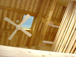 ![]() 吹抜けの居間。2階部分は書斎になっており、テラスに通じています。 | ![]() 天窓があり、明るく快適な空間となっています。天井扇により季節に応じて風向きを変えることができます。 |