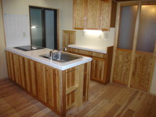 ![]() 玄関から居間を見たところ。お施主様のご要望により、アイランドキッチンになっています。 | ![]() 流し台、吊戸棚、作業台は全て職人による造作です。流し台にはIHヒーターと食器洗浄機を組み込んでいます。 |