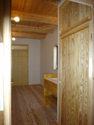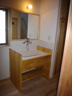![]() 居間から廊下を見たところ。 | ![]() 洗面台も造作です。材料はイチョウ、天板はキッチンと同じタイルを貼っています。 |
