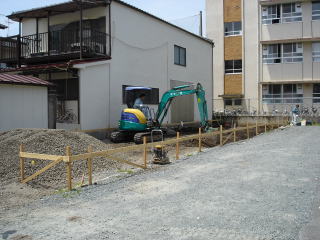 ![]() 重機で土を掘削して土を搬出します。 | ![]() 土を搬出後、砕石を入れて転圧します。 電気、給排水等の配管もしておきます。 ※転圧:機械により砕石を締固めること。 |