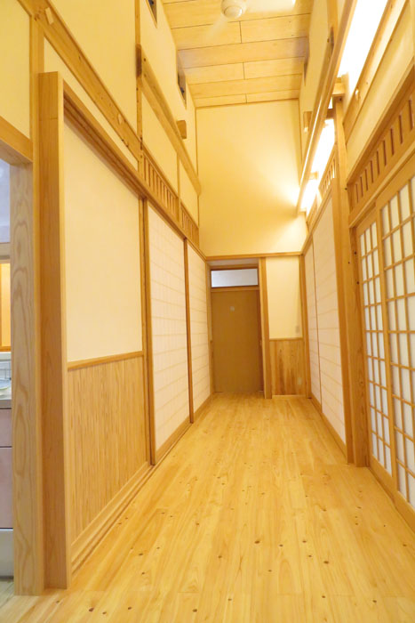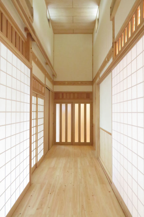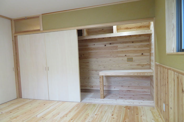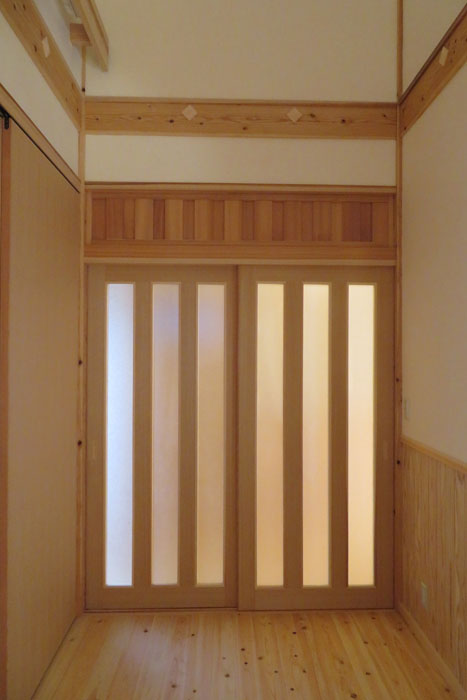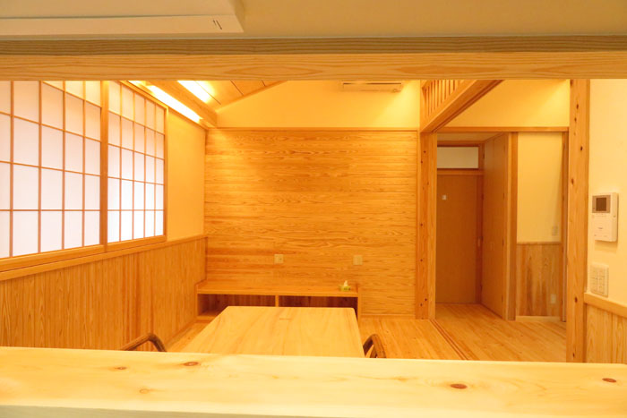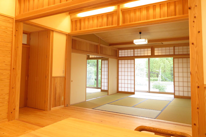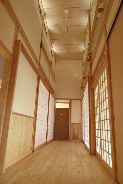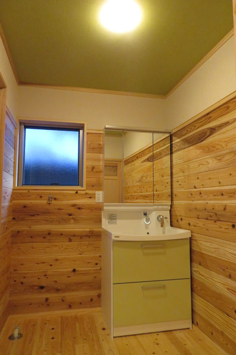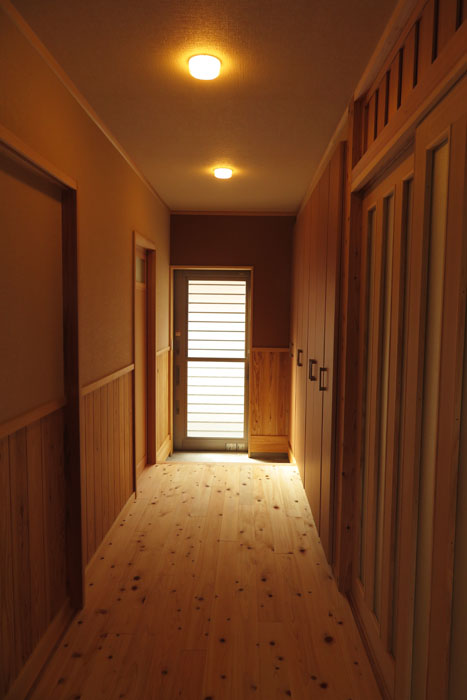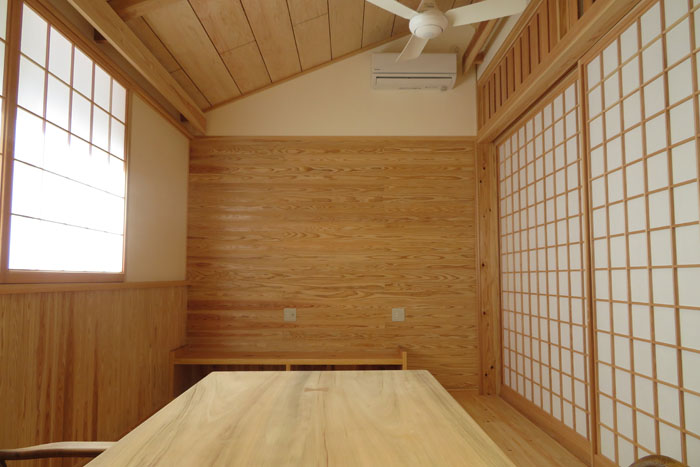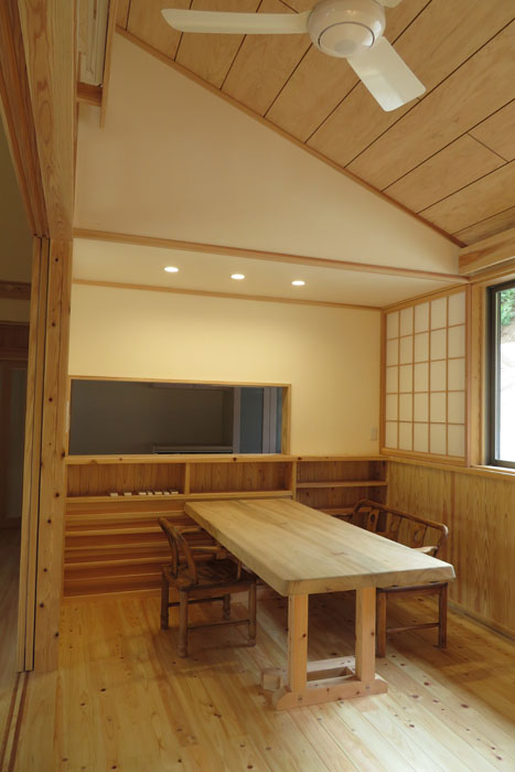 [仕上] 屋根:平瓦葺き 外壁:サイディング張り+杉板目板張り 床:桧フローリング張り 壁:漆喰塗り 腰板(杉羽目板) 天井:各所 杉板張り 針葉樹合板張り
