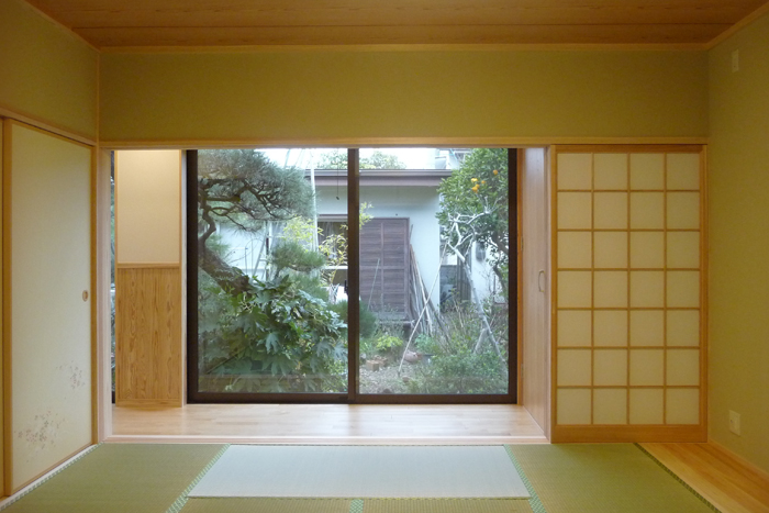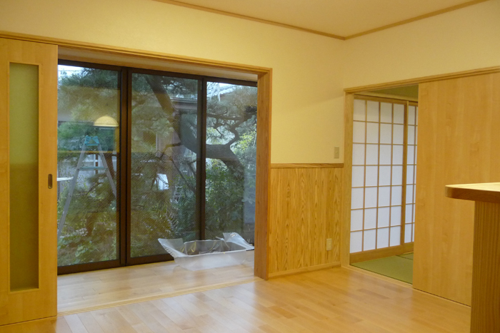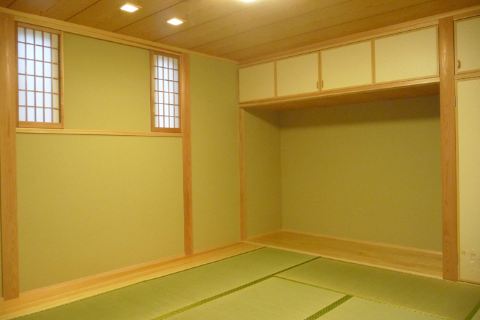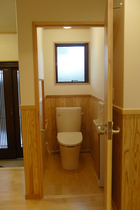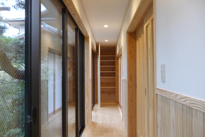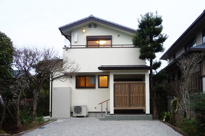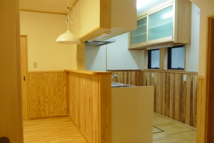 [仕上] 屋根:陶器瓦平葺き 下屋:カラーガルバ横葺き 外壁:モルタル下地 弾性リシン吹付 床:桜フローリング゙貼り 壁:ビニルクロス、杉羽目板貼り 天井:ビニルクロス、杉板貼り