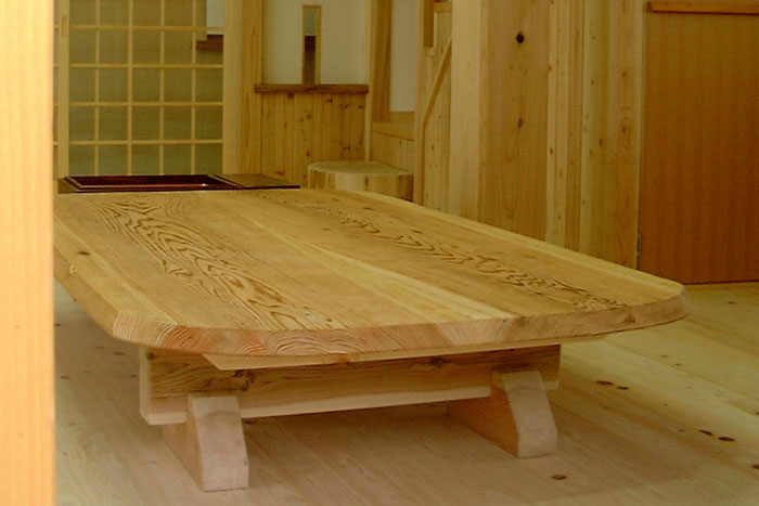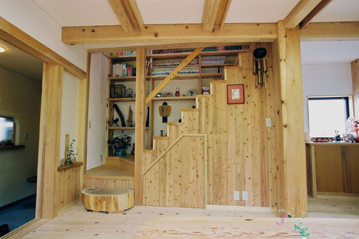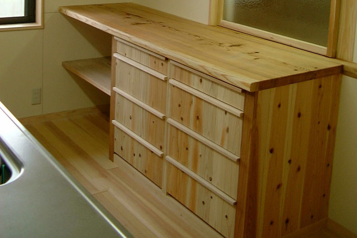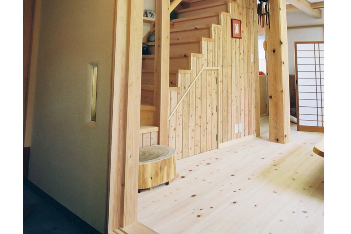 床:檜無垢縁甲板貼り 壁:漆喰塗り ウッドチップクロス貼り 杉板貼り