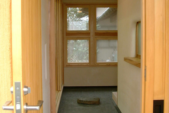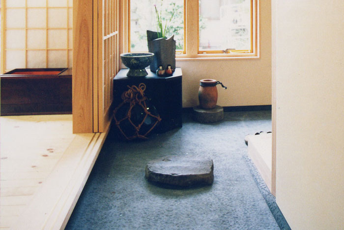 外壁:土佐漆喰半田仕上げ、ガルバリウム鋼板タテハゼ貼り 土間:墨モルタル塗り