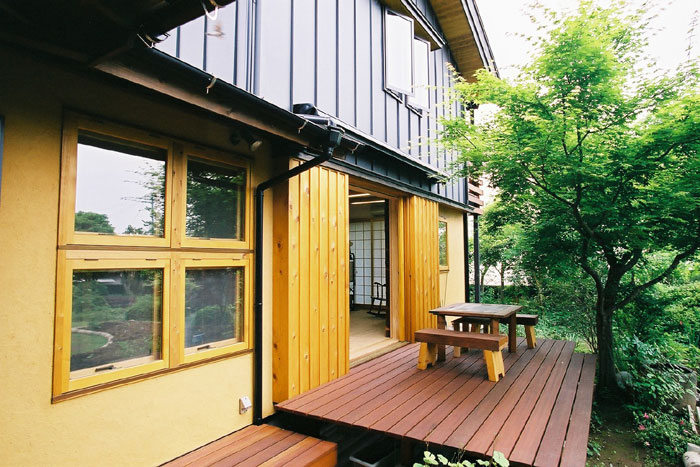 天井:杉板貼り 漆喰塗り ウッドデッキ:セランカンバツ+セトールHLS塗り