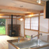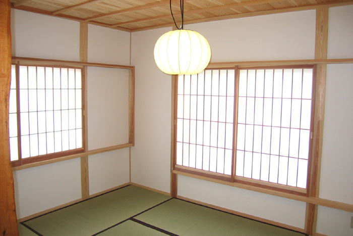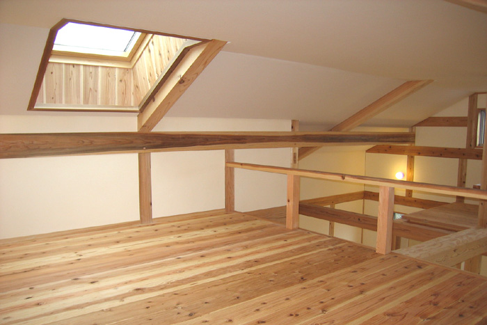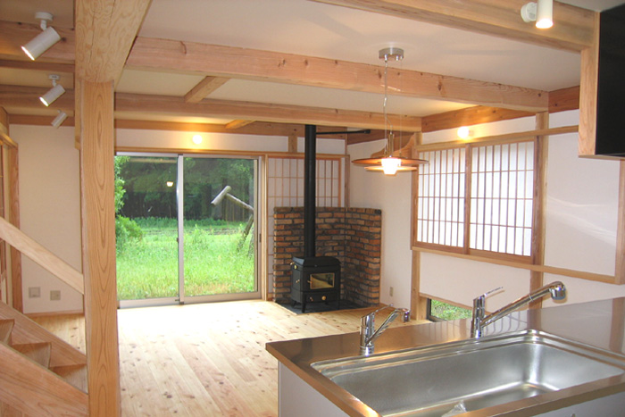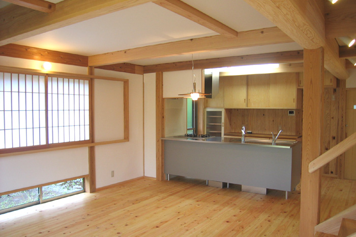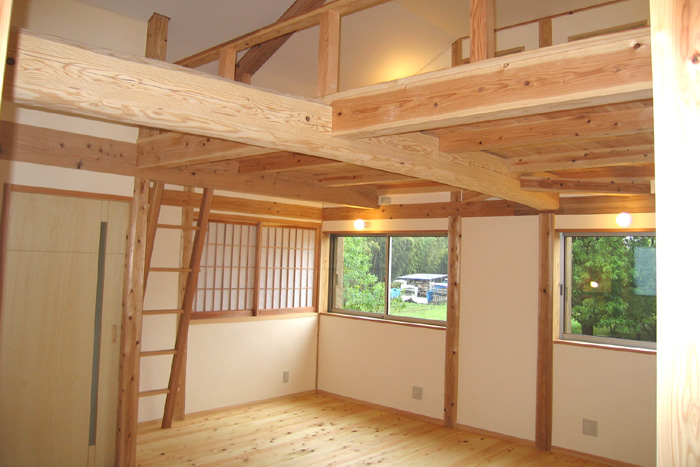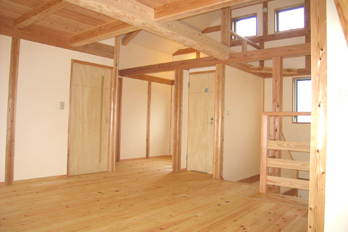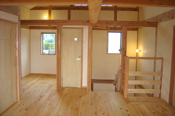 Y邸新築工事 木造平屋建て一部2階建て 設計:(有)FU設計 仕上 屋根 陶製平瓦葺き 外壁 モルタル塗り+弾性リシン吹付、一部杉板 床 桧無垢フローリング 壁 杉板、しっくい塗り 天井 杉板、しっくい塗り